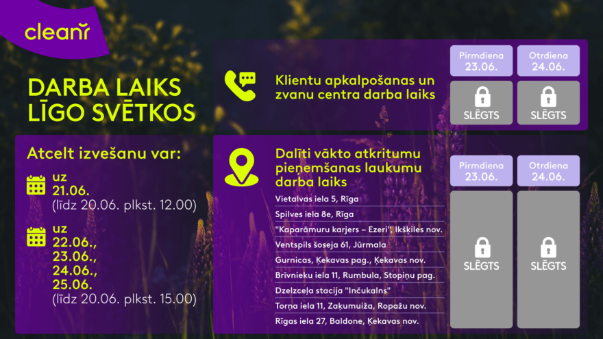 Līgo svētku brīvdienās tiks mainīts “CleanR” klientu apkalpošanas centru, zvanu centra un…