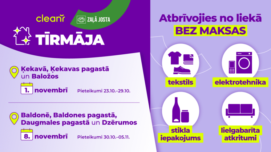 1. novembrī Ķekavas pagastā, Ķekavā un Baložos, savukārt 8. novembrī Baldonē, Daugmalē un Dzērumos notiks akcija “Tīrmāja”, kuras ietvaros iedzīvotāji bez maksas varēs nodot nolietoto…