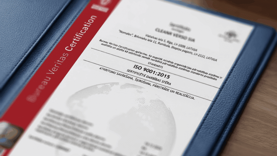 Industriālo atkritumu un būvgružu apsaimniekošanas uzņēmums “CleanR Verso” ir veiksmīgi noslēdzis integrētās vadības sistēmas ieviešanas un sertifikācijas procesu, saņemot trīs starptautiski atzītus pārvaldības sistēmu sertifikātus: ISO 9001:2015 par kvalitātes pārvaldību, ISO 14001:2015 par vides pārvaldību, kā arī ISO 45001:2018 par arodveselības un darba drošības pārvaldību.